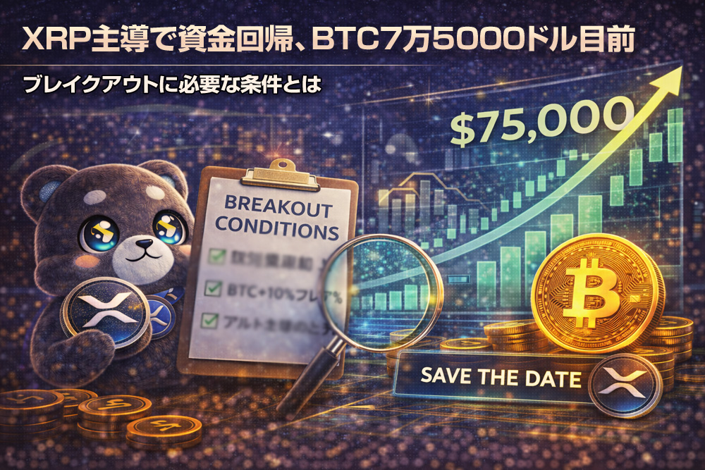 XRPの上昇をきっかけに暗号資産市場全体が持ち直し、ビットコインは7万5000ドル目前まで接近している。しかし、このまま本格的な上昇トレンドに入るためには、いくつかの重要な条件が揃う必要がある。 ビットコインは7万500 … 続きを読む