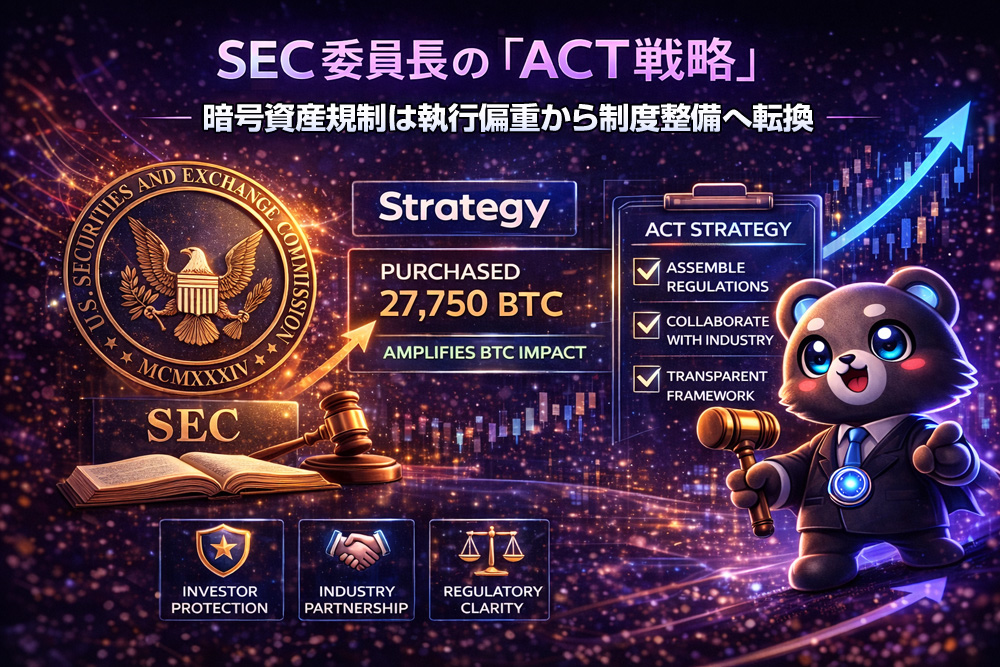 米SECが暗号資産規制の新しい方向性として「ACT戦略」を打ち出した。焦点は、これまでの“訴訟で縛る規制”から、ルールを先に示して市場を整える方式へ軸足を移すことにある。XRPを含む主要銘柄にとっても、この方針転換は中長 … 続きを読む